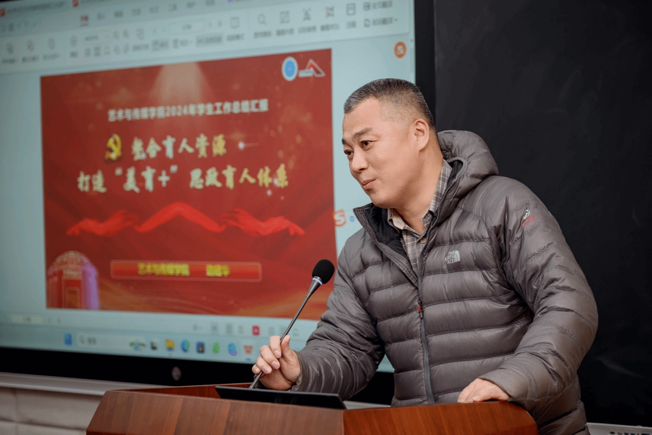 校党委副书记王甫总结讲话。他对学院2025年度的工作成效予以充分肯定,他表示,过去一年,学院领导班子敢于直面问题、勇于担当尽责,聚焦立德树人这一主责主业,积极推动学院高质量发展,党建思政工作特色凸显,导学团队建设成效显著,美育和社会实践工作亮点纷呈。针对做好学院下一阶段工作,他指出:一是要将学院发展融入高等教育发展的整体布局,与学校事业发展同频共振;二是要始终把打造立德树人新格局作为学院立院之本,每位教师都应在提升教书育人质量方面积极贡献自身力量;三是要紧盯设计学交叉学科博士点申报工作,为学院发展筑牢根基;四是要深化改革,不断探索学院转型发展新路径,充分激发干事创业活力,积极营造学院发展的良好态势。
