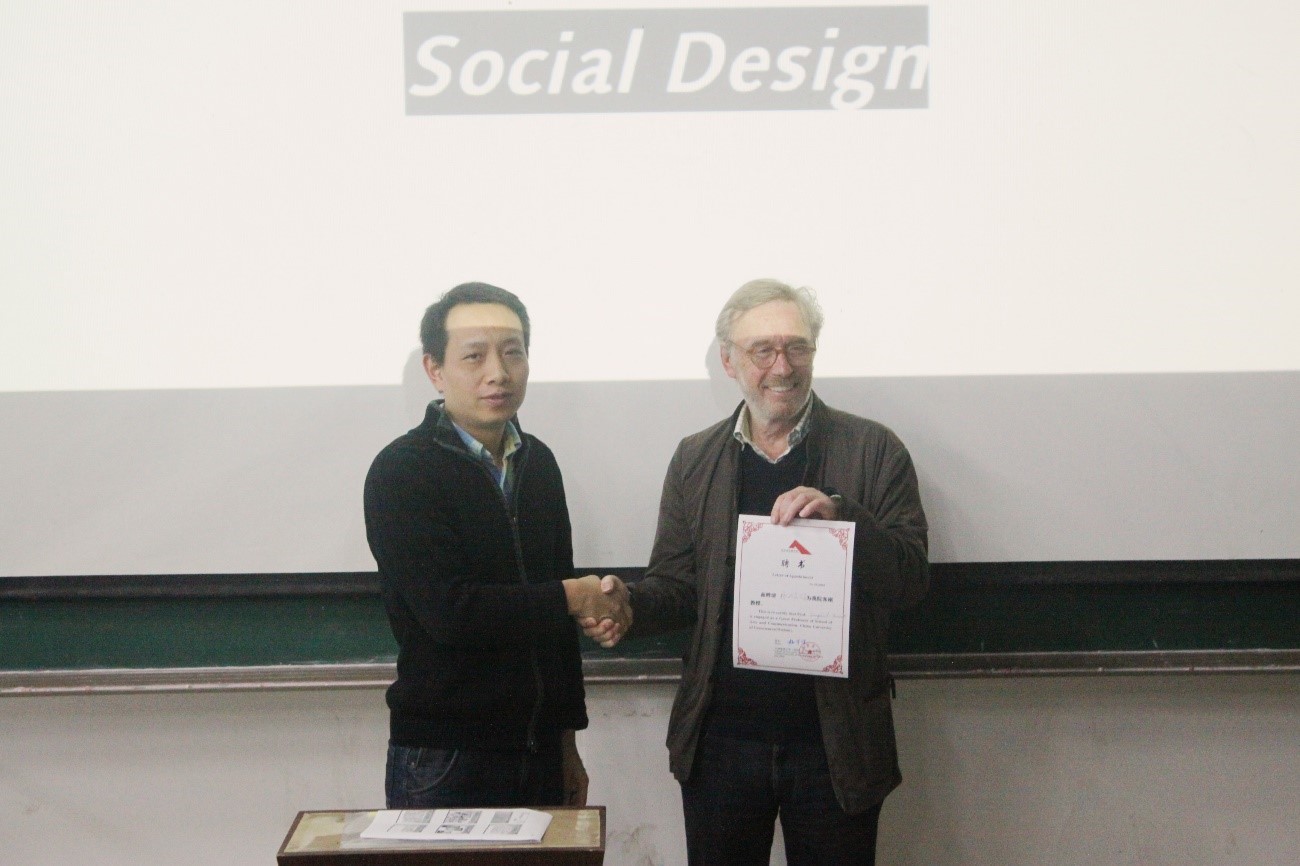 师生带来了一场主题为“Social Design”的专题讲座,讲座由刘军副教授主持,程璜鑫老师翻译。桂宇晖院长曾健友副院长等多名院领导出席了本次讲座。