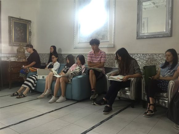 8月30日,这是写生实习小组正式为罗马写生展做准备的一天,明日下午,大家努力了十多天的创作成果将展现在画廊中,由特邀而来的各界人士欣赏。一大早,两位带队老师安排小组成员们将自己的写生作品,与装置设计草图摆在酒店大厅中,每人挑选出两至三张能反映意大利风情和个人风格的代表性作品。老师们一个个的为摆开作品的同学们讲评,从手法到思想,为大家指引一条合适的道路。小组成员们或坐或站,都屏息聆听,不敢错过任何一句话。