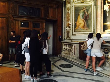 下午,老师决定带写生小组感受一下罗马的古代建筑与卡拉瓦乔的绘画作品。从酒店出来不远处就是地铁站,乘坐地铁到圣母堂附近,参观卡拉瓦乔的《圣彼得上十字架》以及《圣保罗之光》。卡拉瓦乔讲究画面的单一光源与深色背景互相烘托,营造强烈的光感以及深沉的气氛。这种具有戏剧感和真实感的绘画形式如同一柄利剑划破天空,为欧洲油画带来了巨大的震撼与启发。接着,实习小组继续步行到圣奥古斯丁教堂,这里存放着卡拉瓦乔《洛莱托的圣母》。图中圣母抱着小耶稣接受朝拜,画面光线明暗感强烈,人物的神态动作逼真自然,仿佛不在画中,而在眼前。最后一幅画是位于圣王路易教堂的《圣马太蒙召》,一束天光由右侧打来,辛苦一年突然蒙受耶稣召唤的圣马太面容充满了惊喜与激动,而在一旁忙着清点辛苦工作所得报酬的劳工,却没注意到耶稣亲临。由画面传达的这种身临其境的真实感,令同学们久久回味,不愿离去。