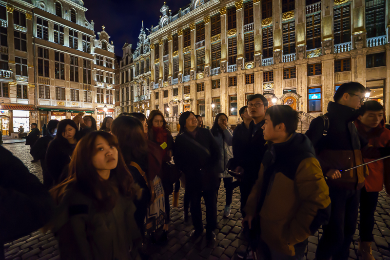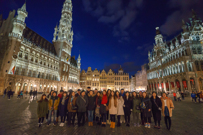 晚18点30分,访学团抵达布鲁塞尔,并在前往布鲁塞尔马格特大公广场进行参观。站在广场的中央,马林老师向访学团介绍道:“在17世纪末期,比利时从荷兰摆脱出来,后根据哥特式教堂的结构建立起了这个皇宫。在其完成之后,当时的比利时新贵族便请来了不同的设计师,并沿着皇宫来建筑自己家族的宫殿。这也就是为什么广场四周的建筑极美,其风格形式却有一定的差别,且不同的宫殿之上还存有不同的家族徽章。”此外,他还表示:“在这里整个建成之后,马格特大公广场便一举成名成为了欧洲最美丽的广场之一,并在早年间被联合国列入了世界文化遗产名录。”说罢,更示意访学团成员对广场及周边的建筑进行仔细的观察。