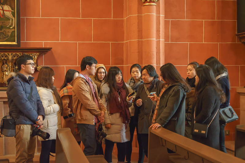 在参观过程中,有访学团成员发现,教堂内部的部分墙柱也是被重新修复过的,其以钢筋混凝土为支撑,外刷一层红漆,并不是用红色石块堆砌而成。对此,马林老师则惋惜的表示:“不仅是墙柱,教堂内部的多块玻璃也都在二战中被毁坏,虽然人们致力于将它修复成原始的模样,但是再怎么修复,都达不到那种能在玻璃上镶嵌画作的程度了。”