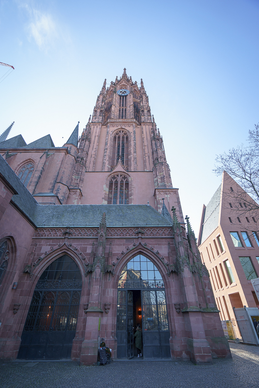 上午10点25分,访学团一行进入老城区,经国家现代美术馆,抵达法兰克福凯撒大教堂。法兰克福凯撒大教堂是一座典型的哥特式建筑,至今已有600多年的历史。教堂虽经过多次战争的洗礼,却依然屹立于此。站在教堂前的街道上,马林老师向访学团详细介绍了法兰克福凯撒大教堂的历史,并表示:“在二战时期,法兰克福凯撒大教堂的顶部曾被轰炸,虽然教堂的钟楼幸得留存,但教堂大部分区域都被严重损毁,所以直至如今仍在修复之中。”随后,访学团进入到教堂内部进行参观。
