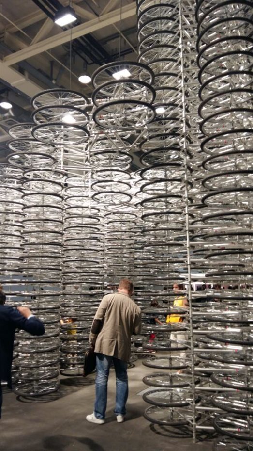由于作品众多,当代艺术系教师当天主要参观了意象无限(unlimited)展区。意象无限展区向以最前卫大胆,最具突破性和实验性著称,它通过展出各类前卫作品来挑战传统展会的形式和规则。展区入口,最显目的是中国艺术家艾未未的装置作品《stacked》,以众多自行车轮胎堆积而成。在这一展区的还有中国艺术家张恩利的《空间绘画》,刘韡的《东方no.5》,刘创的《爱情故事》等。 其中张恩利的作品由205个纸箱组合而成,艺术家在纸箱内部完成绘画。
