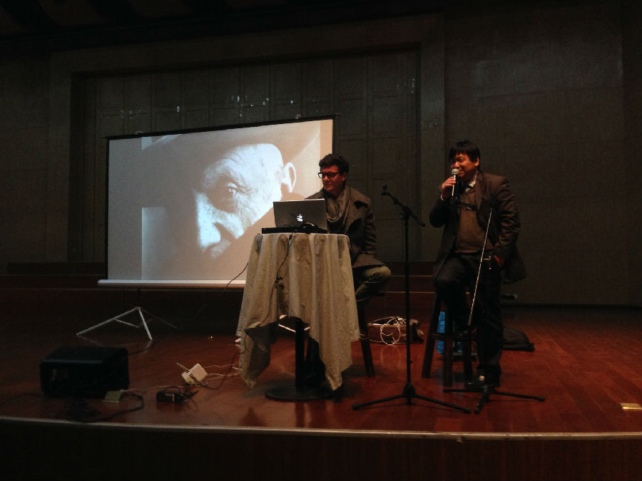 讲座由马蒂奥·巴西勒主讲,他的作品在2009年威尼斯双年展上获奖。威尼斯双年展是三大世界顶尖展事之一。马蒂奥介绍了自己的作品及作品变化过程。他透露,作品的灵感主要来自文艺复兴时期的作品。他曾借用绘画大师卡拉瓦乔和保罗·乌切洛作品中的一些元素来进行再创作。借鉴保罗·乌切洛战争题材作品中的造型和动态,马蒂奥邀请Facebook上的60位朋友来进行表演。虽然这些朋友并非专业演员,但拍摄的作品在意大利引起广泛的影响。