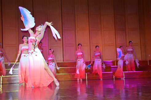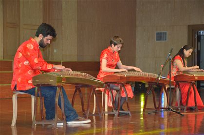 由阿尔弗莱德大学古筝乐团带来的两首古筝合奏将演出推向第一个高潮,一曲是《渔舟唱晚》,一曲是《沧海一声笑》。古筝团指导老师、阿尔弗莱德大学孔子学院国家汉办教师吴中蓓说:“中国的古筝有两千多年的历史。我们首先给学生介绍的是中国民乐的传统,通过像《渔舟唱晚》这样的古筝名曲让美国学生了解中国人的精神情怀。《沧海一声笑》来自武侠电影,他们对中国的武侠很感兴趣,也通过这个让他们更了解中国文化。”