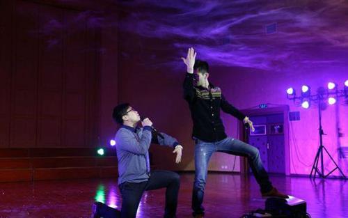 罗文旭老师和肖泽朦老师演绎的《新贵妃醉酒》将晚会推向了一个高潮。肖泽朦老师的舞蹈和罗文旭老师的反串引得在场观众连连尖叫。音乐系2011级学生雷云连呼,“老师的表演太给力了!”