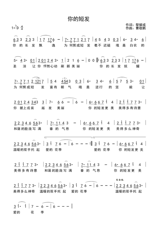 《你的短发》由中国音乐家协会黎耀成作词,污污漫