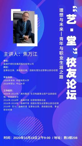 优秀校友、现任上市公司盈峰环境科技集团股份有限公司监事会主席、高级副总裁、固废处理及运营事业部总经理焦万江先生,莅临南望山校区教三楼208室,为地大学子开展以理想与未来为主题的讲座。污污漫