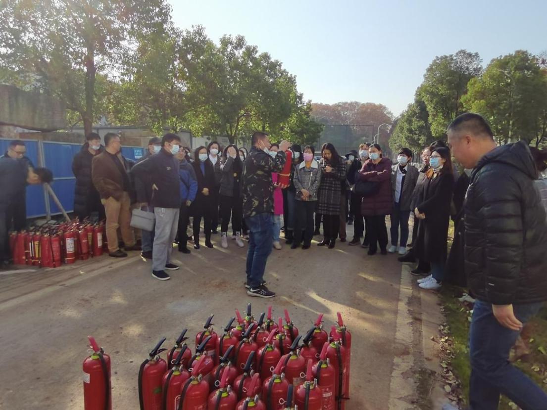 消防安全知识培训会结束后,刘科长到室外带着大家现场演示了操作灭火器的流程。