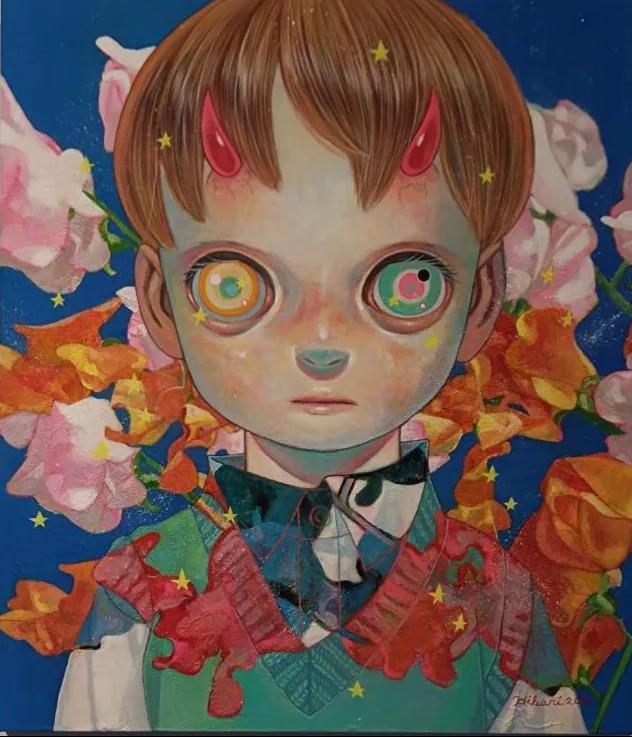 观展中,桂宇晖教授为现场参展观众做作品介绍,从艺术品运用的材质、手法、意识形态及流派等方面展开深入介绍与赏析。例如下田光的恶魔之角系列作品,虽然主色调是明快鲜艳的卡通色彩,但桂宇晖教授着重指出画面中与卡通色彩共存于画面中的“恶魔之角”。作品描绘了一个可爱与恐怖并存的世界,这个世界中既有闪闪发光、甜美动人、迷人放松的画面,也不乏恶魔、战争、伤害与death等明示或暗示的恐怖元素。这赋予了作者儿童肖像画以无数的可能性。对于在平面空间或者浮雕中, 运用不同的材料进行构思、排列、粘贴的一种绘画表现形式, 把一些材料黏贴到画布上来代替纯手绘的图形, 并且混合使用的拼贴作品。