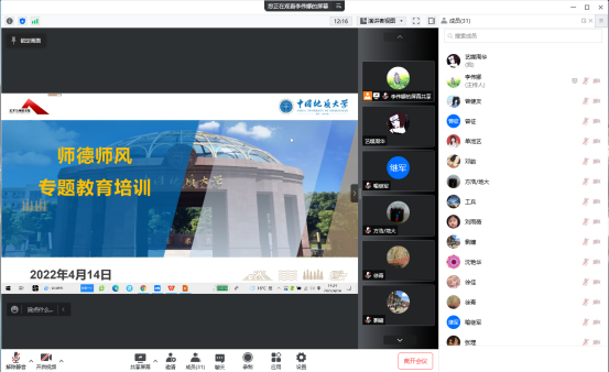 (通讯员:李伟娜 摄影:刘定耀 周华)4月14日下午两点半,学院党委理论学习中心组在学院1209会议室开展集中学习师德师风专题内容,学院领导班子全体成员及三级单位负责人在学院1209会议室参加现场培训,其他教职工通过腾讯会议线上聆听。会议邀请了校学术委员会道德分委会副主任宁伏龙教授做专题讲座,本次大会由学院党委书记郭秀蓉主持。