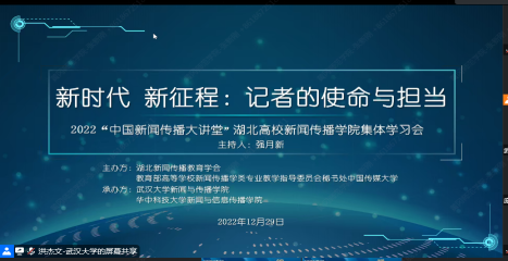 (通讯员于梦涵 王琦)2022年12月29日下午是支部主题日活动时间,为创新支部学习形式,进一步深入贯彻学习党的二十大精神,下午14:30,新闻传播系支部组织动员师生参加以“新时代 新征程:记者的使命与担当”为主题的2022年中国新闻传播大讲堂——湖北分会场在线学习会,来自省内23所高校、2000余名师生参加,污污漫