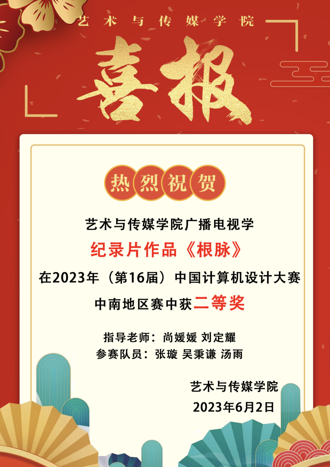 广播电视学本科生张璇、吴秉谦、汤雨创作的纪录片《根脉》(指导老师尚媛媛、刘定耀)在数媒动漫与短片-纪录片专业组类别中荣获二等奖!