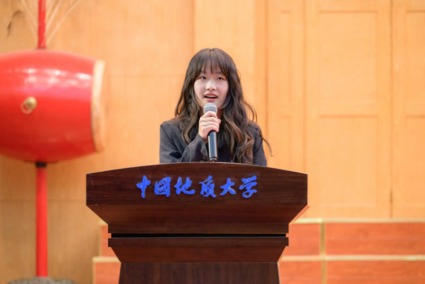 第四项,在校生代表、院学生会主席金煦婷发言。在发言中,她对在地大遇到的言传身教、解答困惑的老师表达感谢,她说道,青春是用来奋斗的,不是用来挥霍的,作为地大人,要贯彻校训精神,努力奋斗。