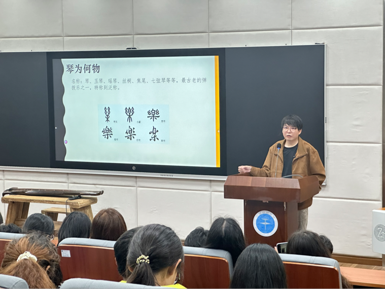 讲座开始,陈宜外老师详细介绍了古琴的历史沿革。他提到,湖北地区在古琴发掘方面有着悠久的历史,古琴早出现在宫廷音乐与祭祀音乐之中,成为中国古代音乐文化的重要组成部分。而在谈及古琴常识时,陈老师从古琴的构造、音色、演奏技巧等方面进行了详细讲解,他指出,古琴的音色独特,具有“清、和、淡、雅”的特点,能够表现出丰富的情感与意境。随后,陈宜外老师深入探讨了古琴文化的哲学艺术性。他认为,古琴艺术不仅体现了中国古代音乐文化的精髓,更蕴含了丰富的哲学思想和人文精神。