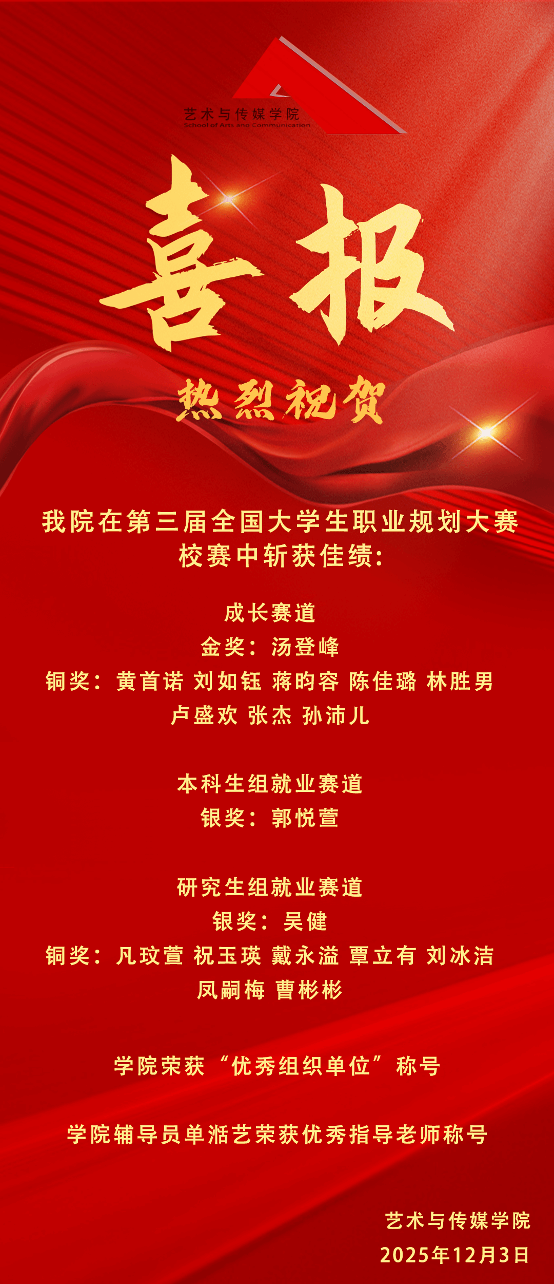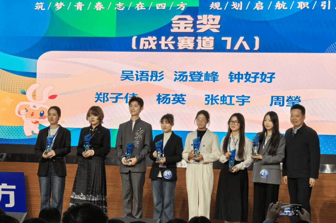 的同学们表现出色,斩获多项荣誉。成长赛道方面,汤登峰荣获校级金奖,黄首诺、刘如钰、蒋昀容、陈佳璐、林胜男、卢盛欢、张杰、孙沛儿荣获校级铜奖;就业赛道方面,郭悦萱荣获本科生组校级银奖,吴健荣获研究生组校级银奖,凡玟萱、祝玉瑛、戴永溢、覃立有、刘冰洁、凤嗣梅、曹彬彬荣获校级铜奖。此外,污污漫