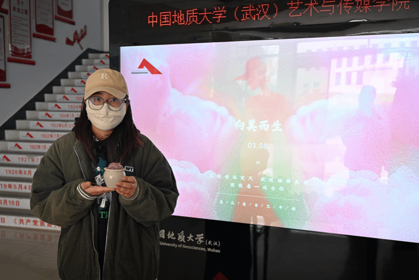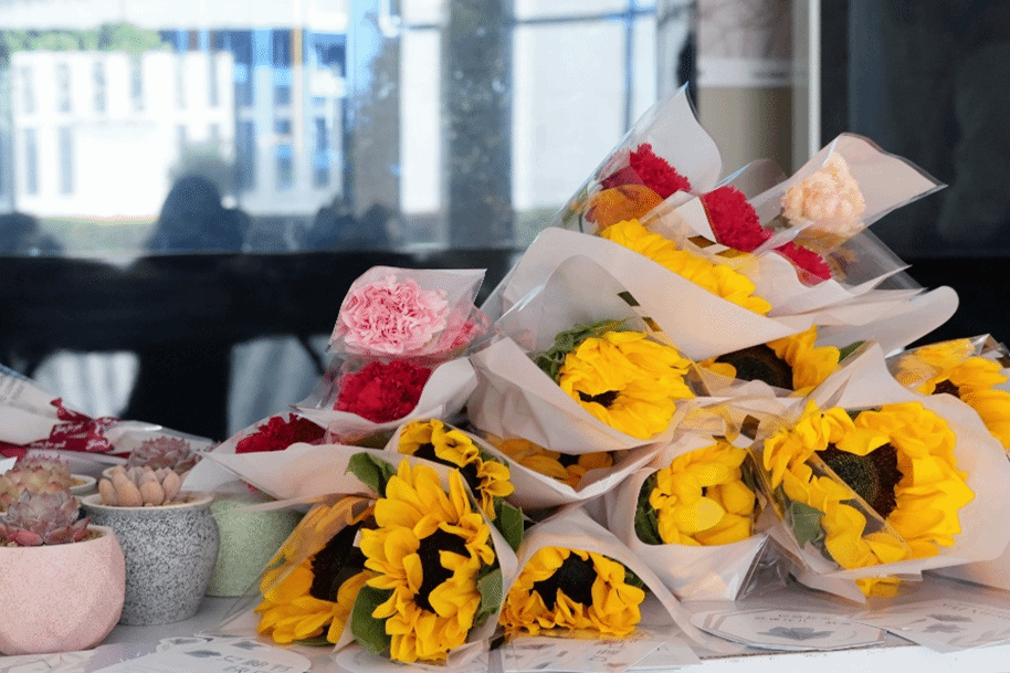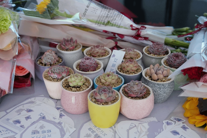 活动现场,一束束康乃馨、向日葵和玫瑰花整齐摆放,十余盆多肉盆栽被志愿者精心地摆成心形花阵,只待女教师和同学们到来,收获这份融合了青春心意与节日温情的特别惊喜。