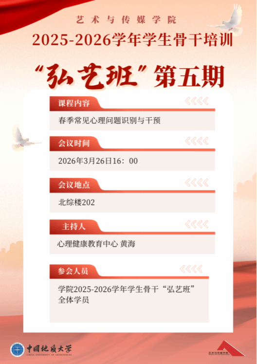 于3月26日下午,在北综楼202顺利举办了2025-2026学年学生骨干培训“弘艺班”第五期专题讲座。本次培训特邀学校心理健康教育中心黄海老师担任主讲人,学院“弘艺班”全体学员参加培训。