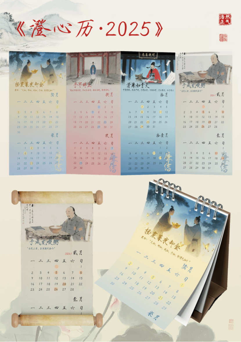 作品简介:作品以朱熹“澄心清意”为精神内核,精选六则古代廉洁典故,配以清雅水彩插画。日历采用宣纸质感设计,每页一故事,辅以廉政箴言。留白处可书写自省笔记,寓意“日日拂尘,时时澄心”,兼具文化底蕴与实用功能。