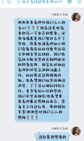 单老师对我班三名同学都进行了毕业情况指导,为我们每位同学都进行了线上学习指导,对我们进行了适当就业和毕业指导,同学们也都对自己的未来有了一定的规划。同学们自己分别在群里讨论了自己关于未来的规划,谈了自己对此次疫情的看法,看得出大家的心态都很好,对我们国家防控能力很有信心。