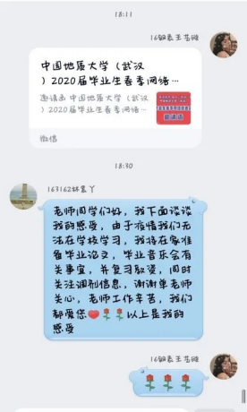 随后,王老师询问了同学们的健康情况,强调大家要注重自身的安全,并且帮助同学们树立抗疫必胜的信心。再次向大家强调了不要提前返校,注意自身安全,配合党和国家的政策安排;最后强调毕业论文的重要性,提醒同学们要利用身边的一切资源赶快开展毕业论文的撰写工作,及时完成任务。