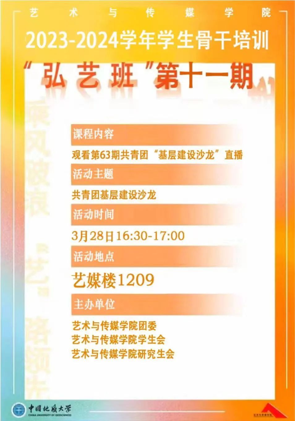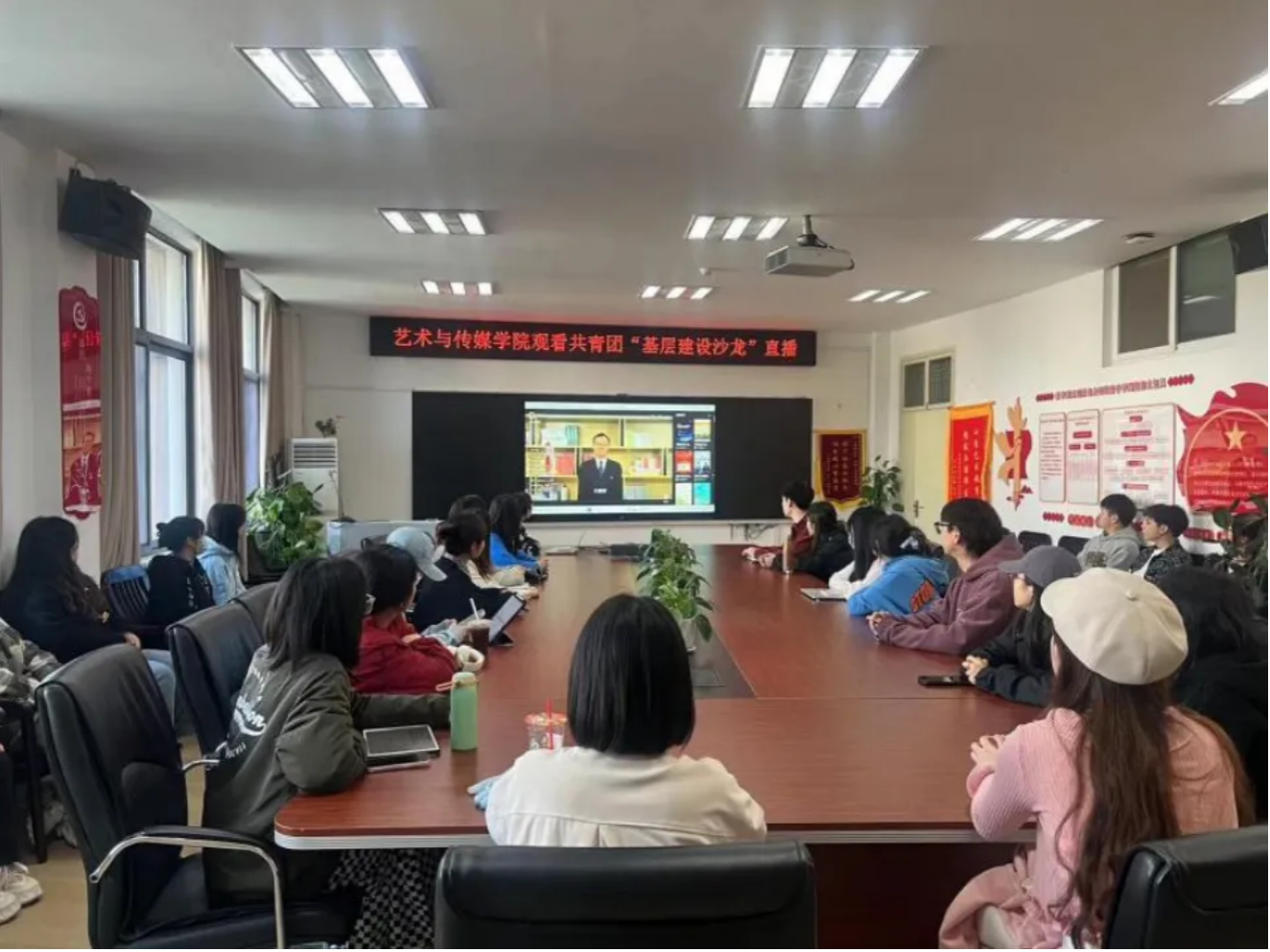 学生骨干培训“弘艺班”第十期在1209会议室顺利进行,学生会、研究生会学生骨干在团委书记单湉艺老师的带领下集体学习观看第63期共青团“基层建设沙龙”直播与“学党史爱祖国教育”线上公益大讲堂。