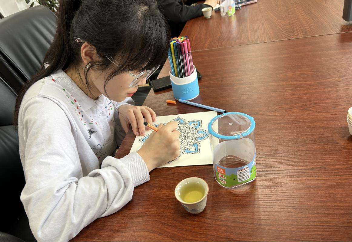 在轻松的音乐中,同学们开始现场绘画,充分发挥创造力和想象力,用色彩和线条绘制出属于自己的曼陀罗之花。