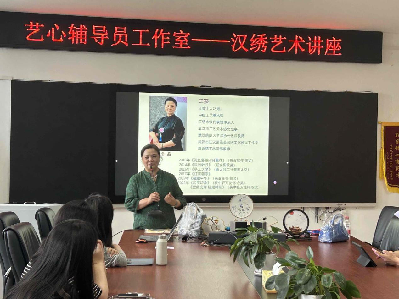5月17日下午,艺心辅导员工作室在学院1209会议室成功举办汉绣艺术讲座,为师生们带来了一场别开生面的文化盛宴。本次讲座邀请到了汉绣代表性传承人、湖北省工艺美术师、武汉纺织大学传承教师,被称为江城十大巧娘的王燕老师作为主讲嘉宾,吸引了众多对传统文化感兴趣的师生前来参加。