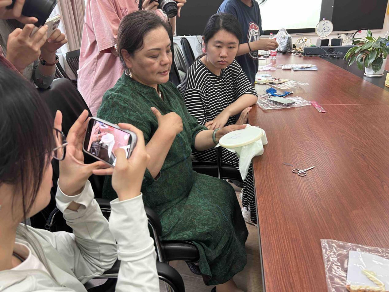 在随后的实践环节中,同学们纷纷动手尝试汉绣制作。在王燕老师的耐心指导下,大家认真学习着针法技巧,感受着汉绣制作的乐趣。