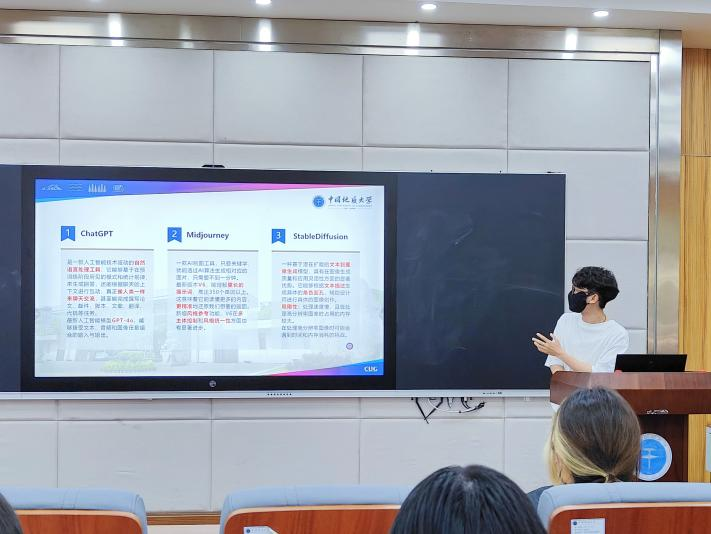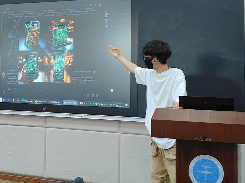接着,由助理班主任刘淼聪向大家介绍如何运用人工智能技术。刘淼聪在向大家科普了国内外与设计专业息息相关的大模型后,展示了人工智能的基本原理和工作方式,并针对当前主流的人工智能工具ChatGPT、Midjourney、StableDiffusion等人工智能工具进行了详细的讲解和实践操作演示。