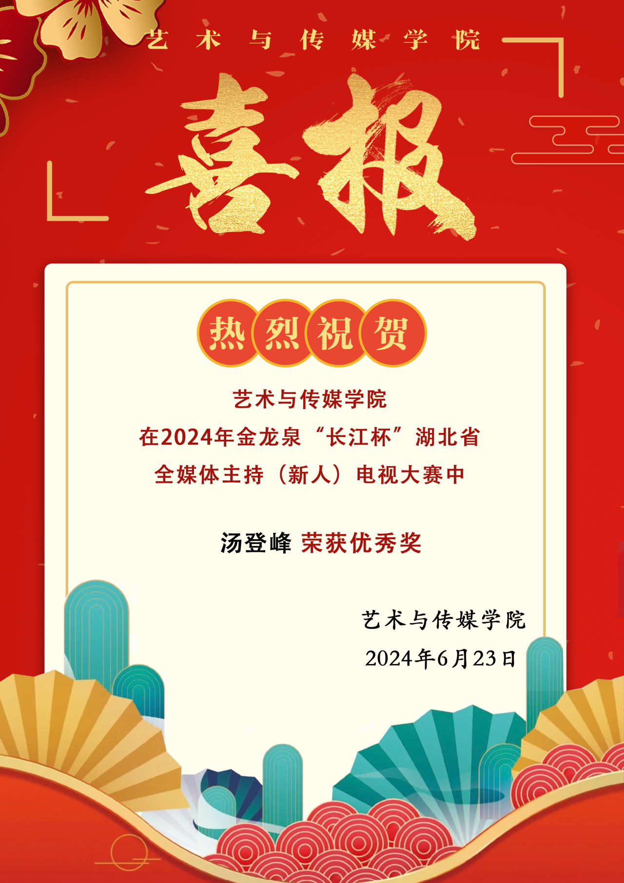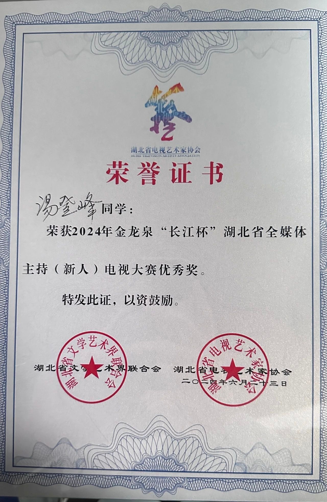 喜报!污污漫 汤登峰同学在2024年金龙泉“长江杯”湖北省全媒体主持(新人)电视大赛中荣获优秀奖!