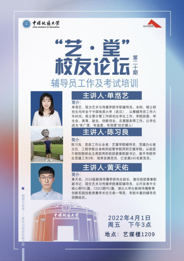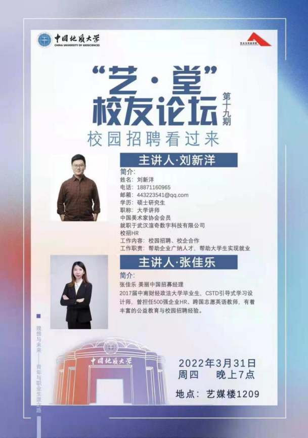 积极与二十多家用人单位开展联络,深耕艺·堂校友论坛平台,邀请企业HR、资深职员进行就业宣讲。本学期已成功举办4期,系列论坛主题包含考研复试分享、出国留学宣讲、辅导员备考座谈会、支教项目宣讲、游戏公司招聘等,为学生带来了有趣味、有启迪、有深度的课堂讲座。