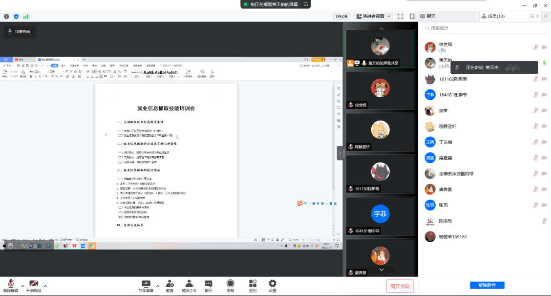 兼职辅导员黄天佑分别从就业信息抓取的重要性、应具备的心理素质、技巧演示三方面展开培训,通过共享屏幕的形式,向同学们演示如何从学校就业信息网、商业类招聘信息平台、考公考编的官网搜索信息、筛查指标、制作台账。他指出,同学们在就业申请过程中要满怀信心、充满耐心、足够冷静,提前准备好求职材料,并定期关注求职进度,养成良好的求职习惯。