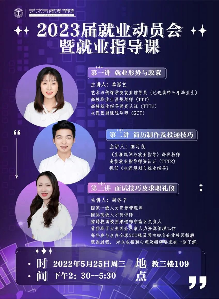 2023届就业动员会暨就业指导课在南望山校区教三楼109教室举行。本次就业指导课以线上和线下的方式相结合,课程内容分为就业形势与政策、简历制作及投递技巧、面试技巧及求职礼仪三个部分。