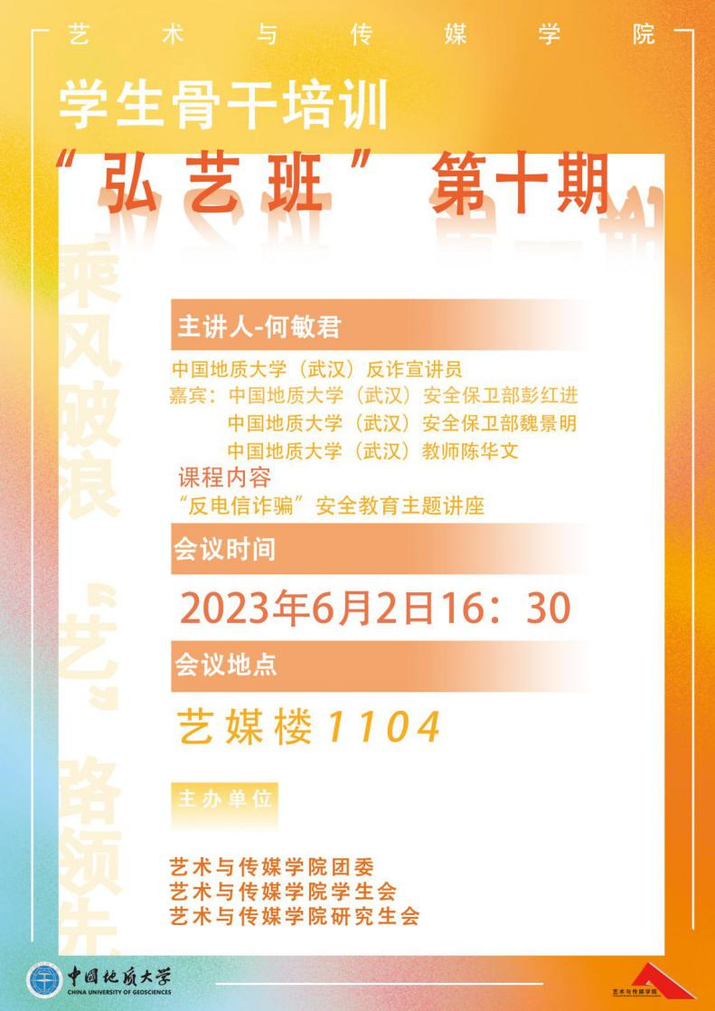 第十期“弘艺班”学生骨干培训在1104报告厅举行,学院研究生会和学生会的主要学生干部以及各班级学生代表参加了培训,本次安全教育培训的主题为《今天你遇到骗子了吗?——防范网络诈骗主题教育会》,由污污漫
