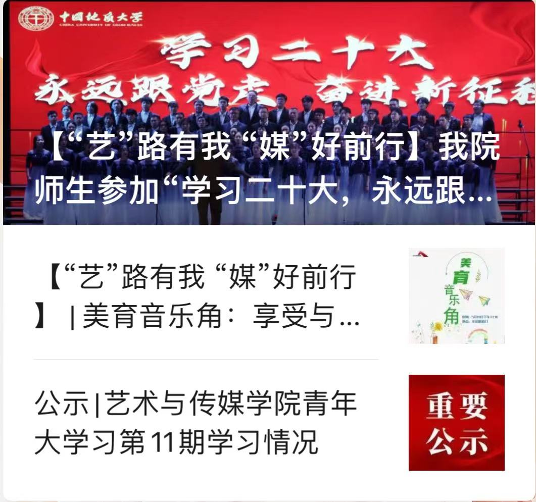 宣传队伍全媒体中心全力投入到“CUG艺媒人”公众号的日常运营中,不断创新媒体作品形式及其内容。在全媒体中心全体成员的共同协作下(20位成员,3名指导老师,1名分管主席,3名部长,14名部员),微信公众号“CUG艺媒人”在2021年度“五月的鲜花”五四评优活动中荣获十佳团属新媒体平台称号,收获院内院外一致好评。