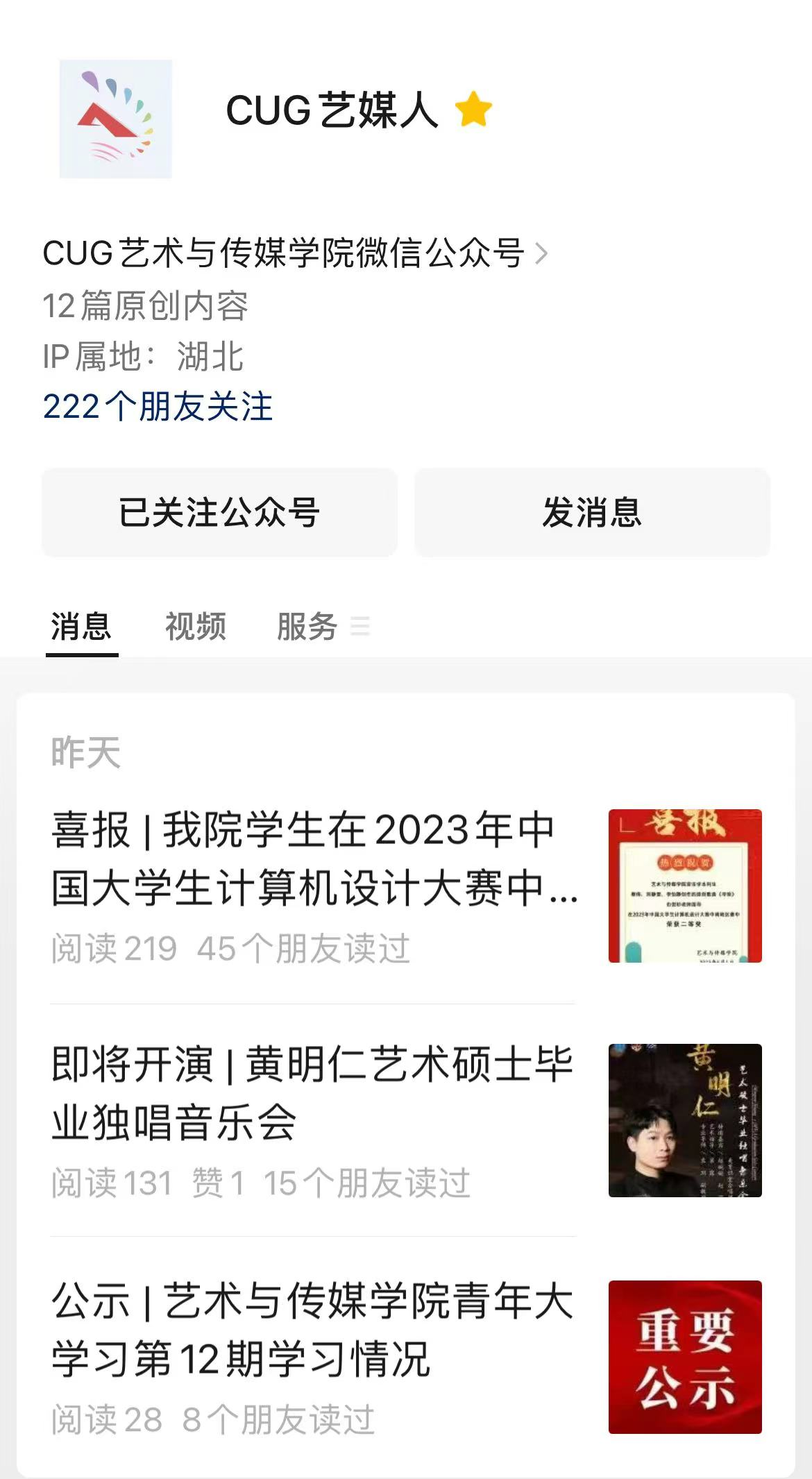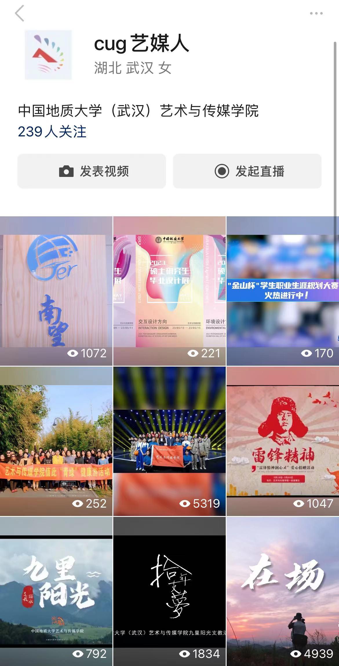 、院会家庭、学术交流、科技成果)、看见艺媒(活动新闻、通知预告、美育课堂、艺媒风采、原创精品),“CUG艺媒人”在2022年1月1日-2022年12月31日共发布402篇推送,按照具体内容可分类为9个板块(活动新闻、通知预告、转载内容、艺·堂、艺媒风采、精彩图集、人物专访、节日特辑和原创精品),总阅读量为13.4万,粉丝数量为4904。同时,公众号已开通视频号“cug艺媒人”,2022年共发布原创视频39个,总播放量为38977,其中原创视频《在场》、《拾年支梦》以及学院师生参与央视《合唱先锋》节目录制系列视频的播放量均在5000+,获得学院师生的一致好评。