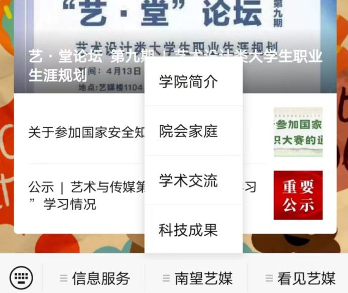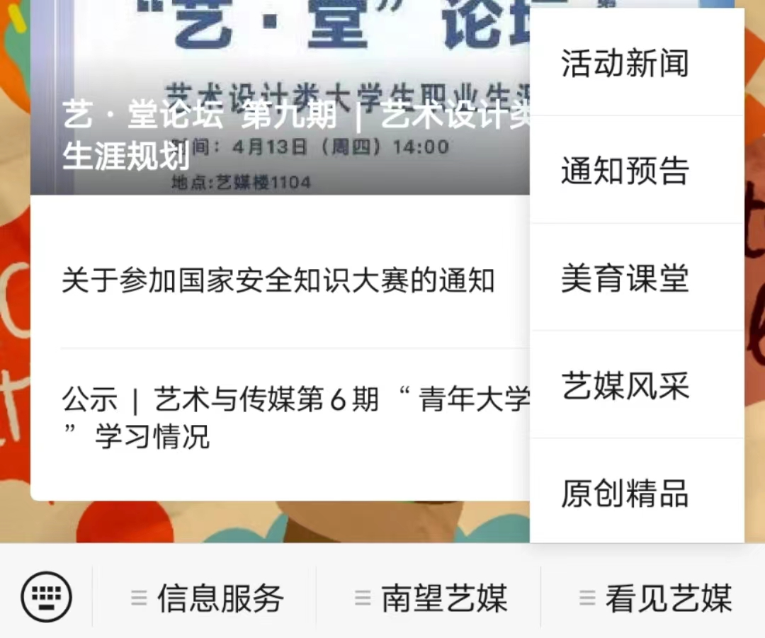 微信公众号“CUG艺媒人”菜单栏经重新设计改版后,现设有3大栏目,分别是信息服务(迎新地图、就业信息)、南望艺媒(污污漫简介