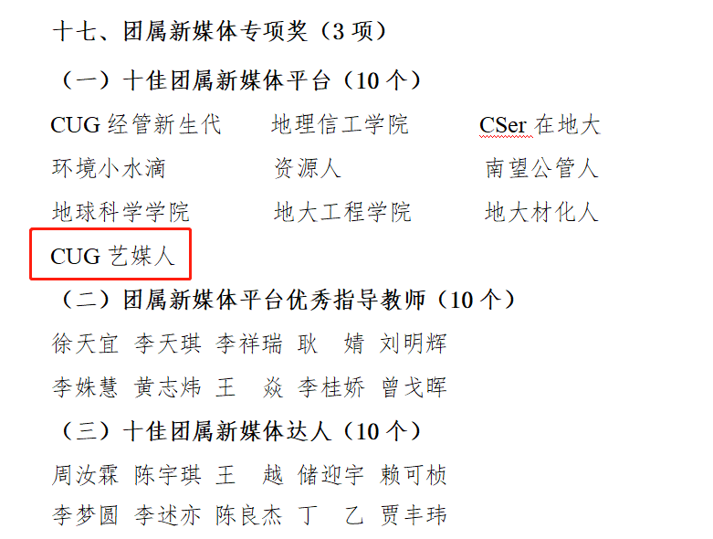 官方微信公众号“CUG艺媒人”以特色鲜明的版式设计、持续性的优质内容输出、准确的角色定位等荣获“十佳团属新媒体平台”、全媒体中心王越荣获“十佳团属新媒体达人”、曾戈晖荣获“团属新媒体平台优秀指导教师”。