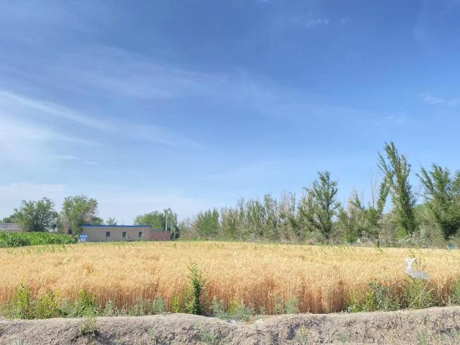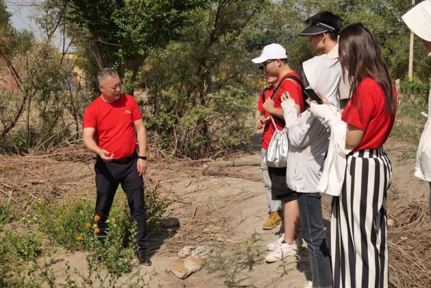 7月5日上午,九里阳光艺术支教团在学院党委副书记边建华的带领下实地感受了新疆生产建设兵团第六师红旗农场学校附近的自然环境,这里地处准噶尔盆地东南缘,南与美丽的天山遥相呼应,北与古尔班通古特大沙漠相连,“春来时淡雅,夏来时苍翠,秋来时多姿,冬来时恬静”。通过边书记的讲解,团队成员了解了新疆兵团独特的地域风貌与风土人情,和城市里用水泥钢筋搭建楼房不同的是,在这里生活的人们通过劳动人民的智慧用“泥土”垒起了一处处冬暖夏凉的平房,路上金黄色的麦田、一望无际的绿色蔬菜地、缠绕在架子上的啤酒花藤蔓、等待成熟的葡萄架等都让成员们心情荡漾。