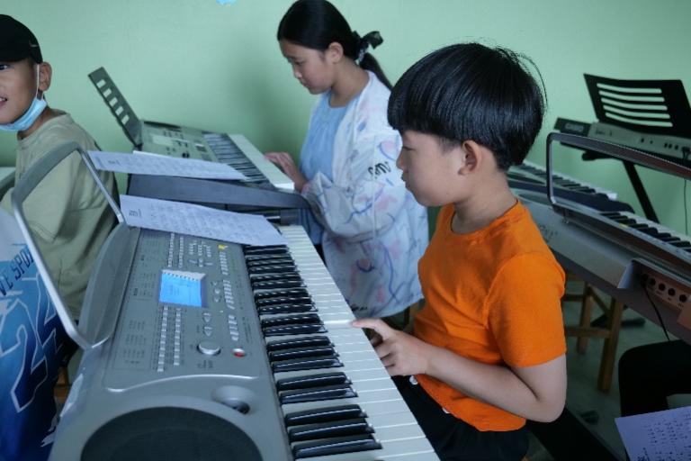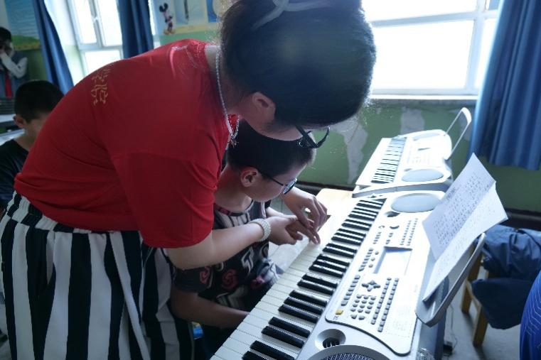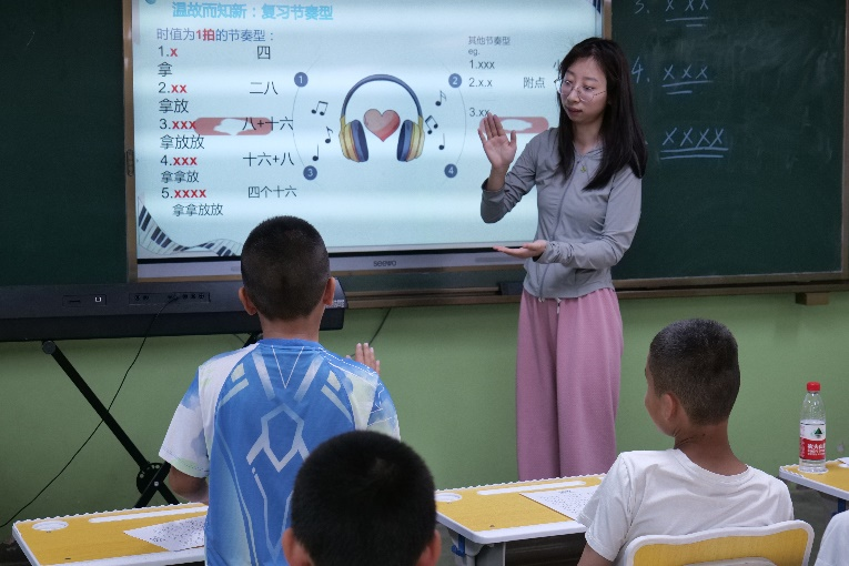 志愿者老师们在音乐课上除了教授一些基础的乐理知识,也带领同学们感悟音乐中的力量,教大家如何打节拍、看音符、控制发音和气息,帮助同学们更好的认识音乐、学习音乐,在弹奏中感受音符的美妙,在合唱中感受音乐的力量,感悟深厚的家国情怀。
