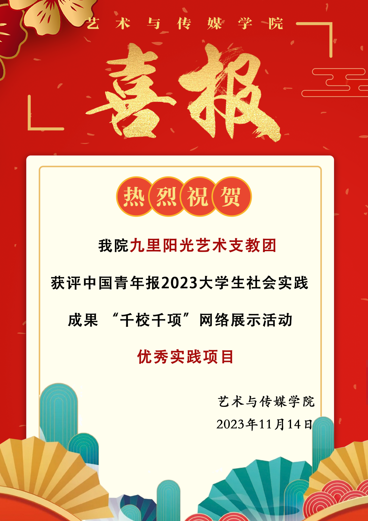 喜报!污污漫 九里阳光艺术支教团获评中国青年报2023大学生社会实践成果“千校千项”网络展示活动优秀实践项目