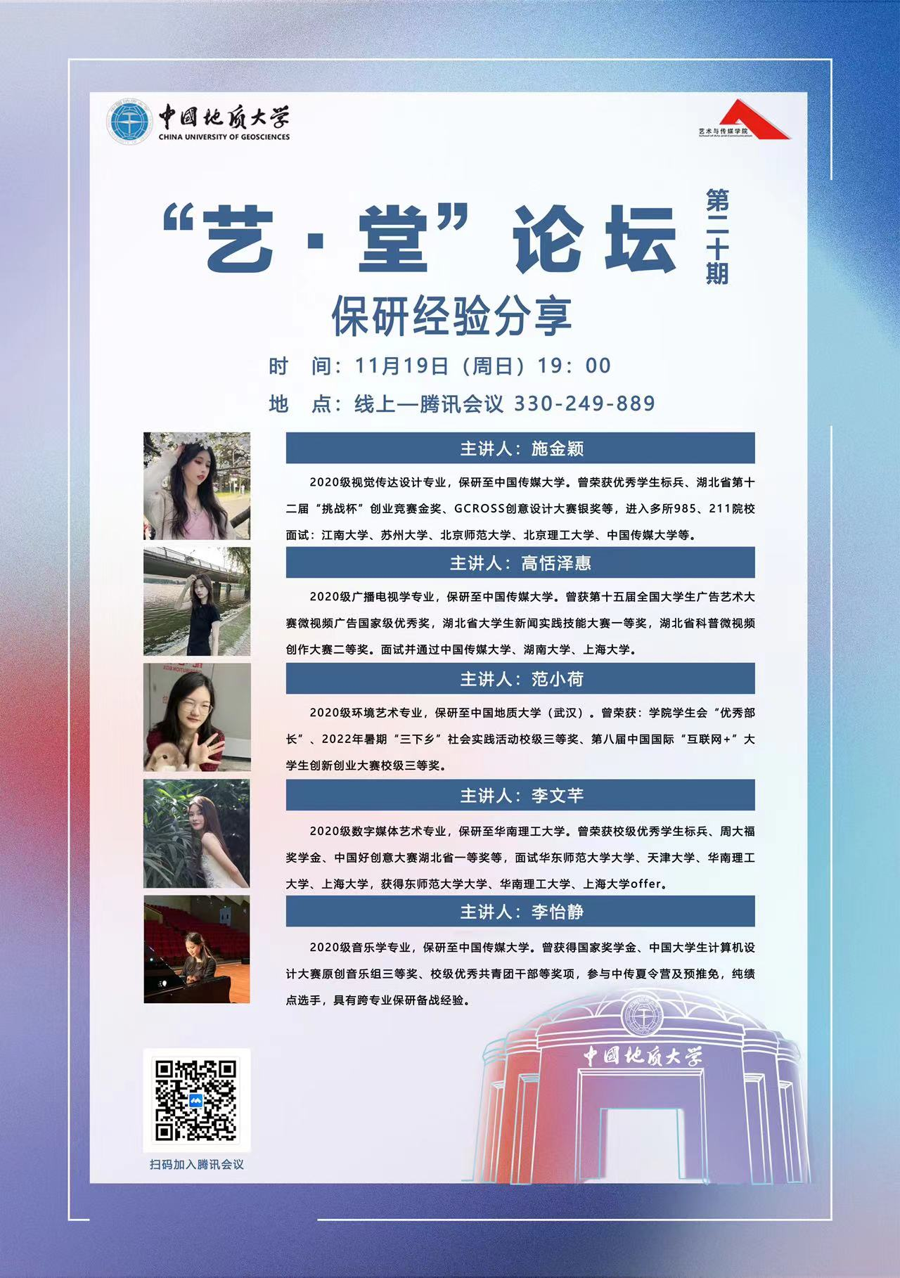 2023年11月19日晚上19:00,“艺·堂”论坛第二十期保研经验分享会于线上腾讯会议平台顺利举行。学院邀请了五位保研上岸的不同专业的同学,分别广播电视学保研到中国传媒大学的高恬泽惠同学、视觉传达设计学保研到中国传媒大学的施金颖同学、数字媒体艺术学保研到华南理工大学的李文芊同学、环境艺术学专业保研到污污漫