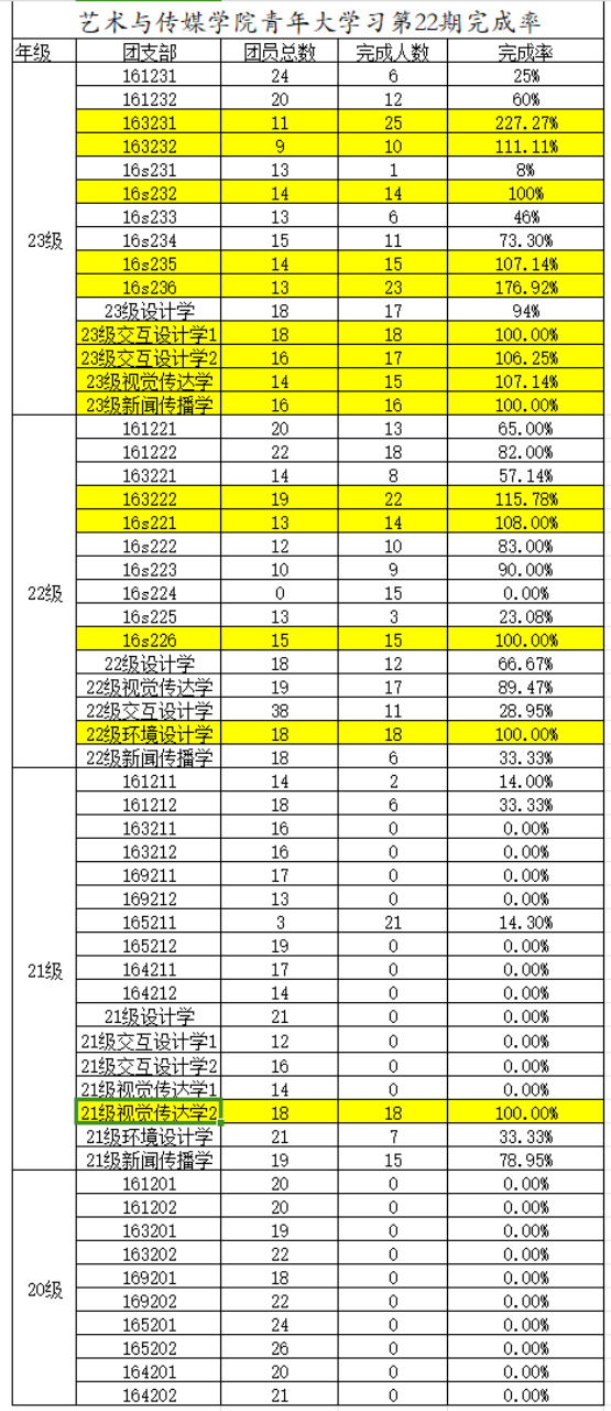 其中163231、163232、16s232、16s235、16s236、23级交互设计学1、23级交互设计学2、23级视觉传达学、23级新闻传播学、163222、16s221、16s226、22级环境设计学、21级视觉传达学2支部完成率高,提出表扬。