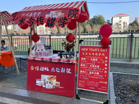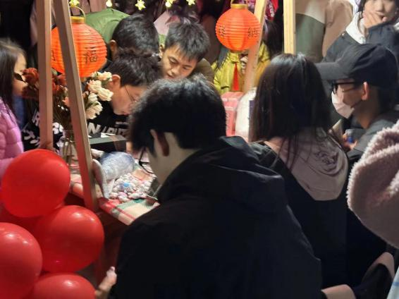 ”几个被红气球簇拥的艺术字体引人注目,两盏红灯笼挂在陈列着鲜花与奖品的桌板上,吸引着同学们的到来。一旁的游戏规则边,驻足着许多跃跃欲试的同学,期待着活动开始。