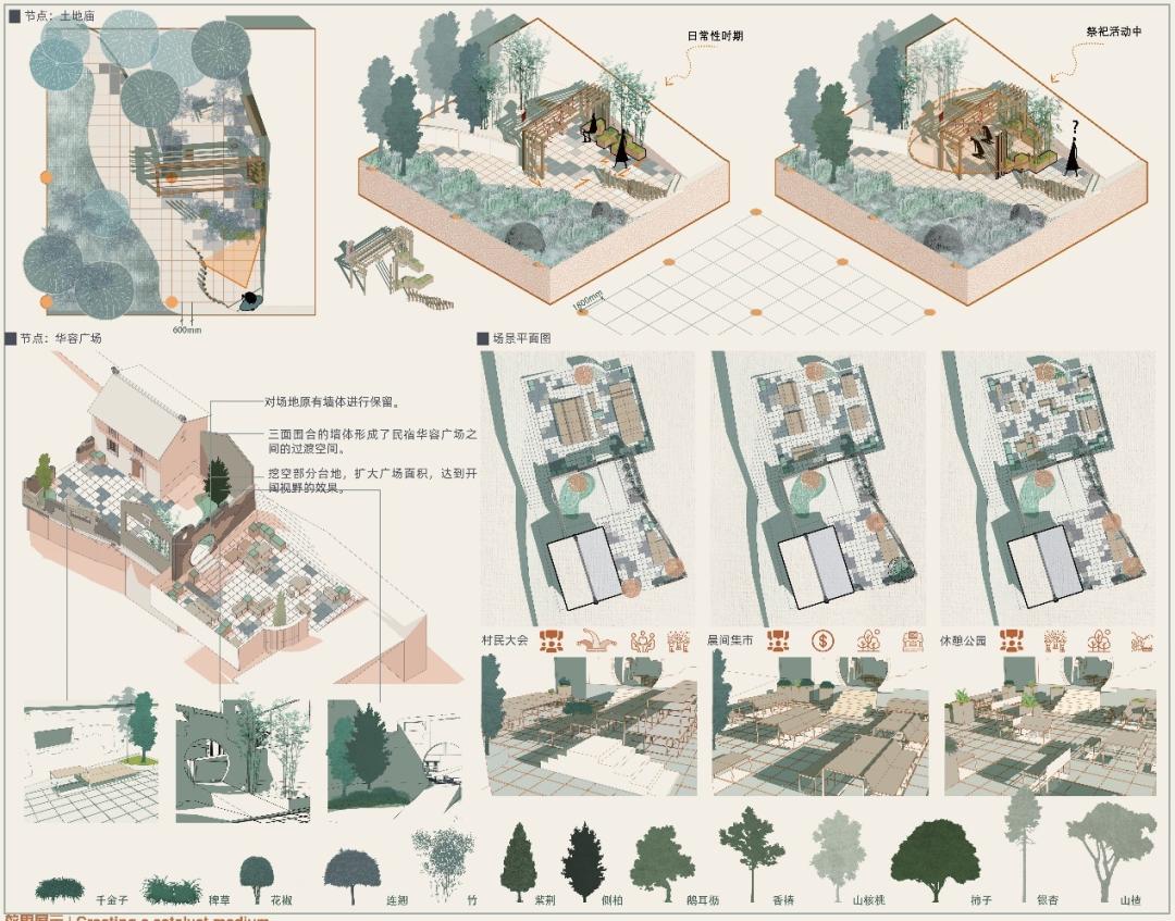 怎么样的设计才能与纣王殿村的现状结合,与触媒理论结合?这一系列问题让我调研回校后依旧进度缓慢,我想了很多方法,参考了很多大佬的方案,深夜emo的时候也曾默默流泪。就如程老师所说,“当你觉得设计很难的时候,可能他就快出来了。”我最终从中国古代益智类玩具——华容道中汲取了灵感,以模块化设计为核心,以主客共享为触媒因子,将村民的意愿和需求作为重要的考虑因素,通过改造乡村内的重要节点,建立可移动、可扩展的模块单元,涉及建筑、公共空间、交通组织、景观等不同空间,以满足不同场景下的不同需求,实现主客共享的功能,进而引发更大的触媒效应,促进整个村庄的发展,完成乡村活化。