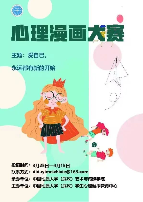 大赛以“爱自己,永远都有新的开始”为主题,旨在鼓励全体地大学子积极参与创作,优化大学生心理素质,关注并帮助疗愈当代青少年的心理问题,提高大学生认识自我、完善自我和发展自我的能力,同时展现出地大学子健康的心理和阳光的心态。