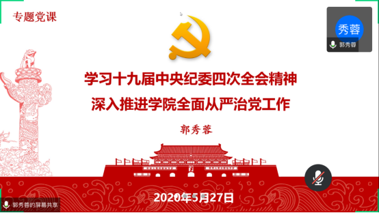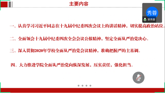 2020年全面从严治党大会暨党委理论学习中心组2020年第4次集中学习。学院领导班子、党委委员、全体教职工党支部书记及院直全体党员参加了本次大会,会议由党委书记郭秀蓉主持。