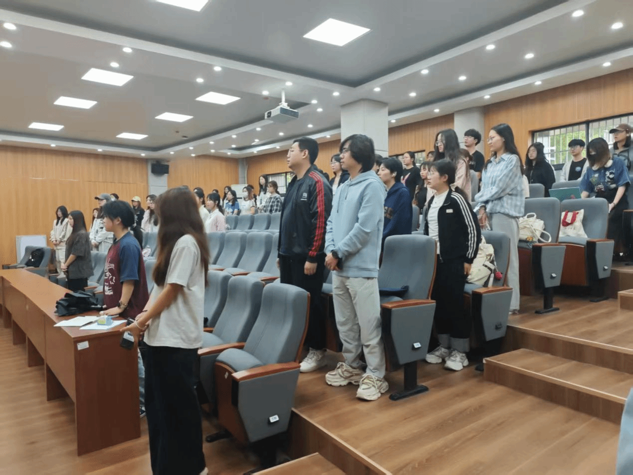全体起立,奏唱国歌。同学们眼神坚定,庄严肃穆,目视前方。洪亮的声音唱出不屈誓言。